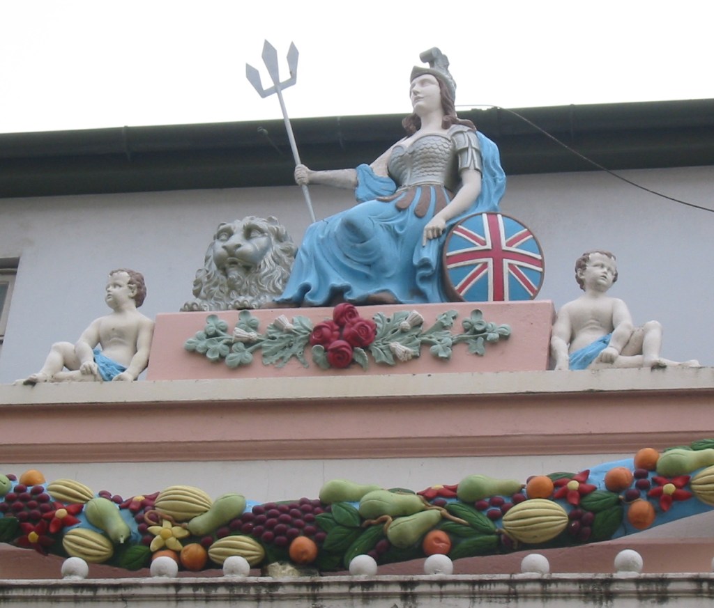 The statue of Britannia and decorative garlands and carvings are the work of Jean Philippe ‘Turnkey’ Giffard, a nineteenth-century Jersey resident and chief warden at the island’s prison. Born in 1826, Giffard was a captain in the merchant marine engaged in the Newfoundland cod trade. It is believed he taught himself wood carving during the long sea voyages. In later life, he moved onto carving stone, and there are examples of his work, including statues and gravestones, across the island, including a carving made from a figurehead recovered from a shipwreck that was placed at one of Jersey’s iconic natural landmarks. During the island’s occupation during the Second World War, the Britannia statue and decorations were the one place a Union flag was left visible by the invading German army.